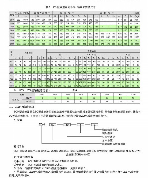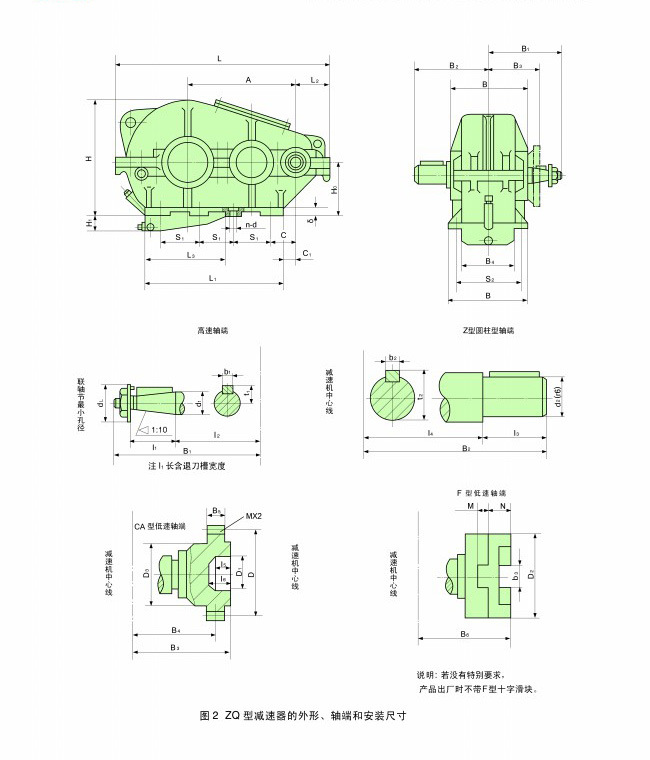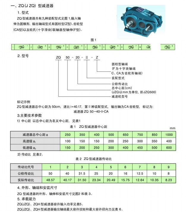 5、此類減速機(jī)傳動比有:48.57、40.17、31.5、23.34、20.49、15.75、12.64、10.35、8.23。   ZQ型減速機(jī)有兩級傳動,裝配型式共有九種,輸入軸伸為圓錐形,輸出軸端由圓柱形(Z型)、齒輪型(CA型、C型)一級歐氏(十字滑塊)聯(lián)軸器(F型)。