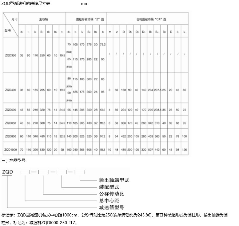 中心距 ZQD型減速器的名義中心距為中、低速級(jí)中心距之和。見(jiàn)下表