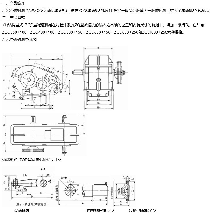 ZQD型圓柱齒輪減速機(jī)是在ZQ型減速機(jī)的基礎(chǔ)上增加一級(jí)高速級(jí)成為三級(jí)減速機(jī),擴(kuò)大了減速成機(jī)的傳動(dòng)比。