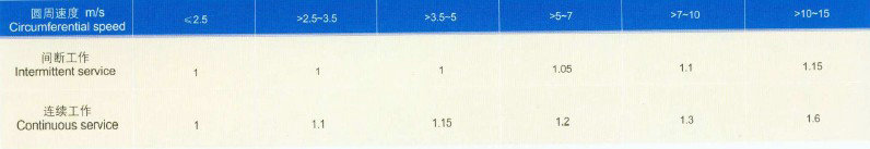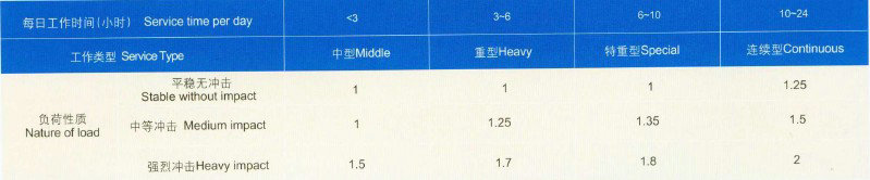 a.減速器入軸功率為電機(jī)功率的0.94—1.4倍時(shí),即按單級(jí)選用方法計(jì)算后,K1。K2之乘積小于1.4者,可以電機(jī)全容量選用。以”○”表示,并定名為基本規(guī)格。常用于平穩(wěn)連續(xù)或輕度;中擊的工作負(fù)荷。