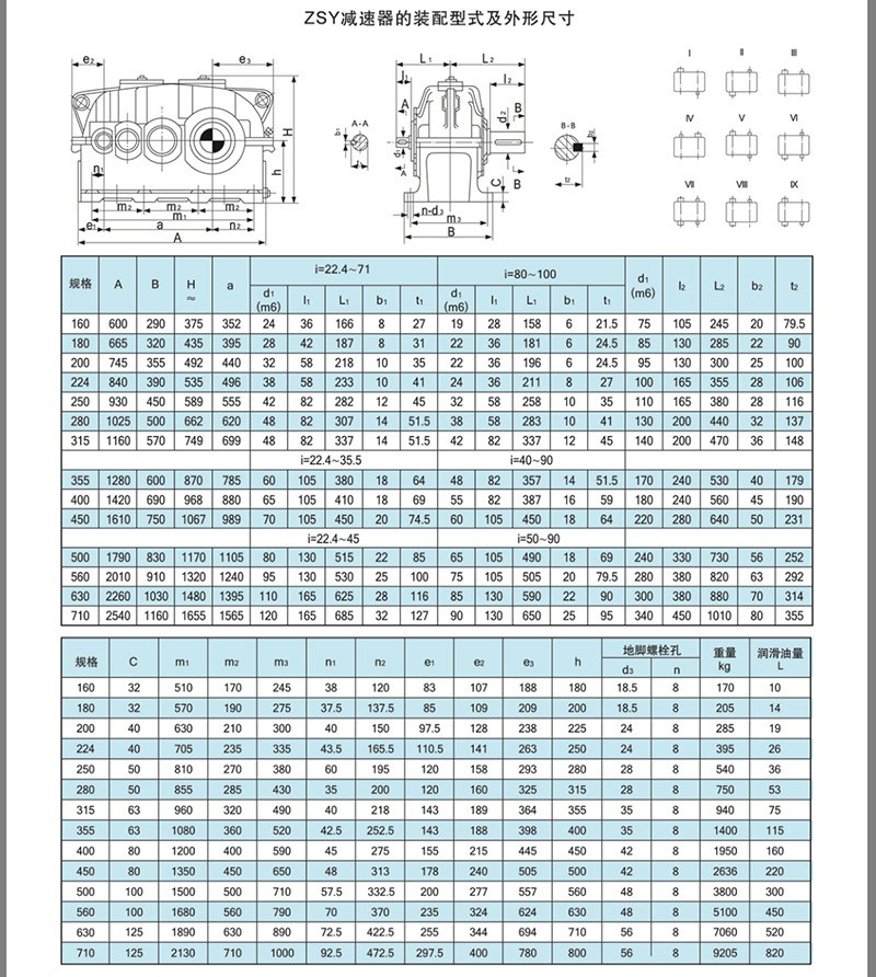 ZSY160減速機,圓柱齒輪減速機是三級齒輪減速機,它是平行軸減速器,此類減速機中心距,公稱傳動比等主要參數(shù)均經優(yōu)化設計,主要零、部件互換性好,齒輪均采用優(yōu)質合金鋼經滲碳、淬火而成,齒面硬度達54-62HRC,該產品體積小,重量輕,精度高,噪音低,一般采用油池潤滑,自然冷卻,工作環(huán)境溫度為-40+50度,如果低于0度,啟動前潤滑油應預熱至0度以上,本減速器可用于正反兩個方向運轉。ZSY圓柱齒輪減速機有22.4,25,28,31.5,35.5,40,45,50,56,63,71,80,90,100十四種傳動比,九種安裝方式